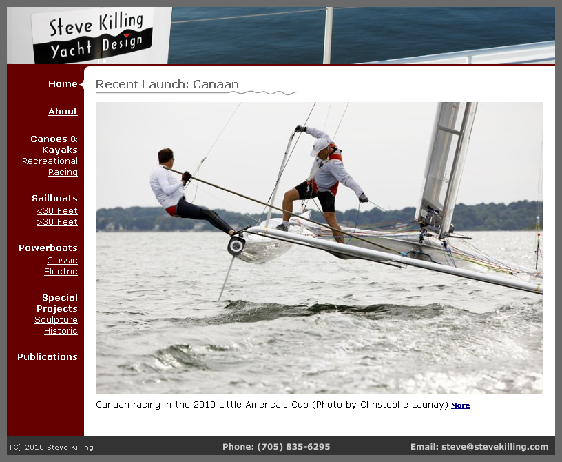 Steve Killing is a yacht designer known around the world for his marine design projects from recreational canoes to America's Cup racers. His website showcases his projects in a simple but clean format and allows easy expansion as future projects are added.